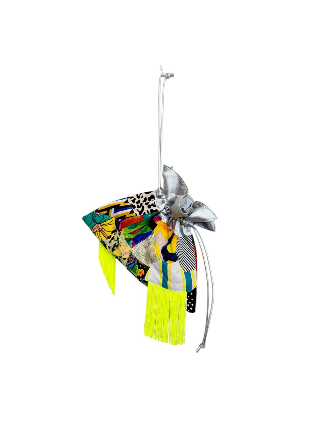 古着やデッドストックの生地でつけ襟を作り、その際に出たハギレを贅沢に使用し、しなやかなで動きのあるフリンジをプラスしてひとつひとつ異なる個性的なデザインに仕上げました。
