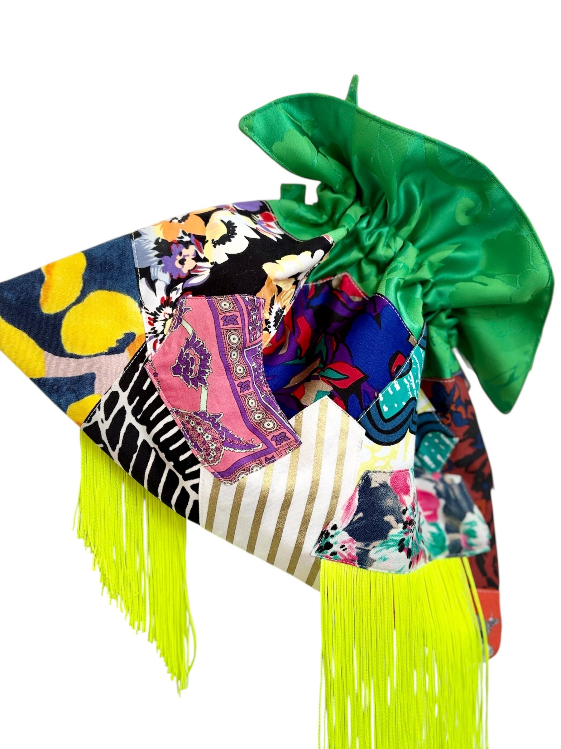 古着やデッドストックの生地でつけ襟を作り、その際に出たハギレを贅沢に使用し、しなやかなで動きのあるフリンジをプラスしてひとつひとつ異なる個性的なデザインに仕上げました。